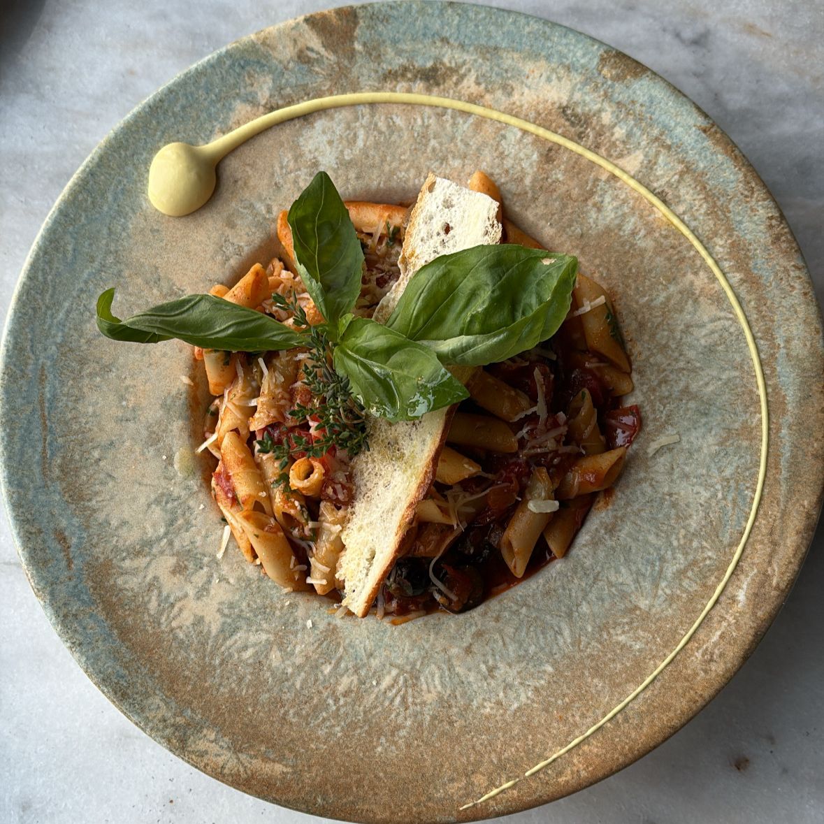 مكرونة بنا مع شرايح الزيتون وصلصة الطماطم وجبنة البرميزان وفلفل شيلي فلاكس الحار